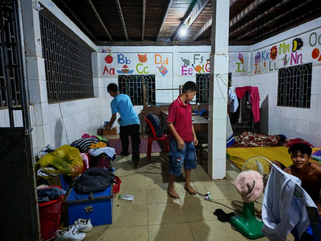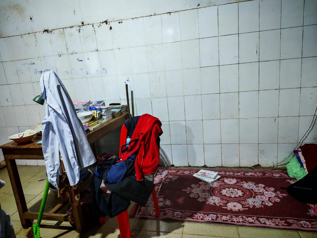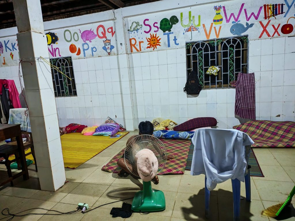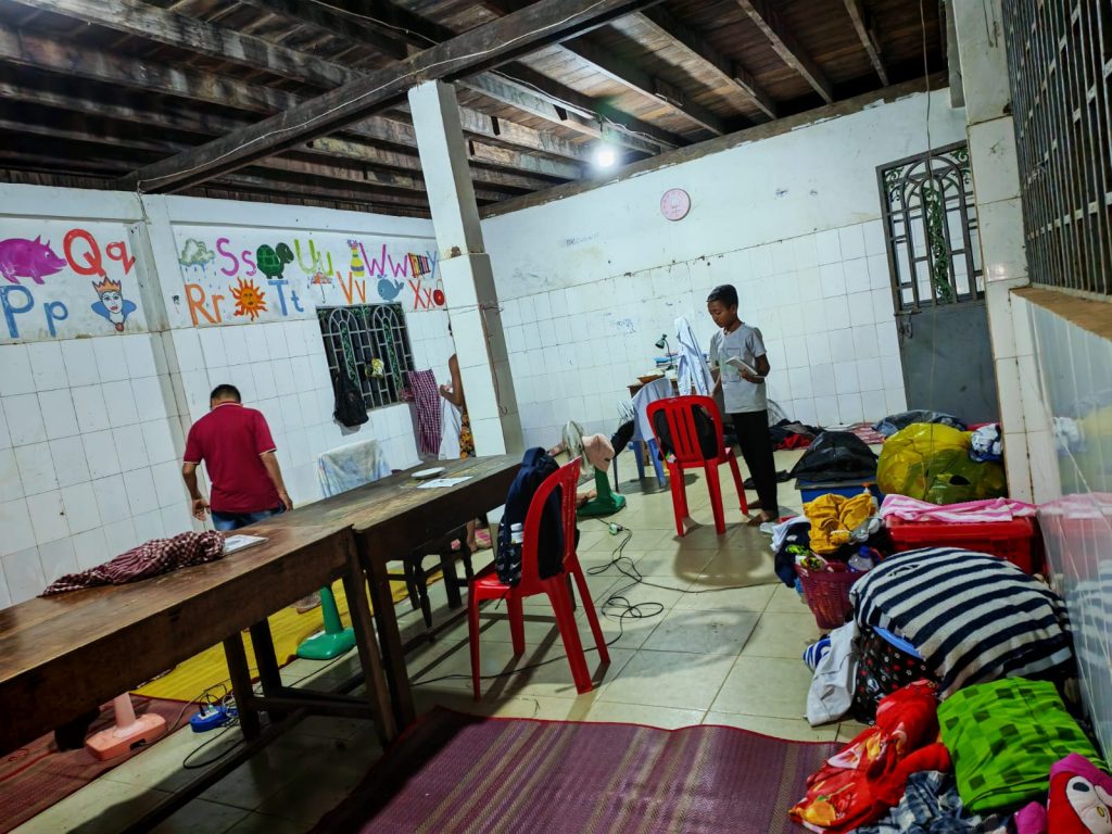 Pendant les travaux du dortoir des garçons de l’orphelinat de Kampong Thom, le bâtiment n’est évidemment plus habitable. La fin de la pluie le permettant, les enfants se sont organisés pour aménager la base du bâtiment (sous pilotis).